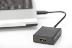 Urządzenie jest zasilane bezpośrednio z portu USB, więc nie jest potrzebny żaden zewnętrzny zasilacz. Na komputerach można używać nawet dwóch adapterów jednocześnie, a monitory można podłączać i odłączać bez restartu systemu. Adapter dodatkowo automatycznie wybudza się z uśpienia lub hibernacji, zapewniając płynny powrót do pracy.