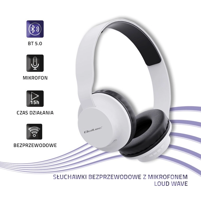 Bezprzewodowe słuchawki z mikrofonem i Bluetooth 5.0. Do 15 h pracy, zasięg 10 m, radio FM, asystent głosowy i wskaźnik LED. Lekkie i wygodne.