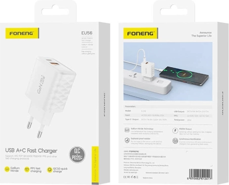 Ładowarka Foneng EU56 imponuje kompatybilnością z większością urządzeń na rynku dzięki obsłudze protokołów takich jak PD2.0/3.0, QC2.0/3.0, AFC, FCP oraz PPS. Posiada port USB-C do szybkiego ładowania o mocy 20W oraz port USB-A, który zapewnia 18W z technologią QC3.0, co umożliwia ładowanie dwóch urządzeń jednocześnie. Dzięki swojemu unikalnemu designowi inspirowanemu łuskami ryb, jest nie tylko funkcjonalna, ale i stylowa. Kompaktowy rozmiar idealny do użytku w domu oraz w podróży, zapewnia szybkie i bezpieczne ładowanie bez przegrzewania urządzeń.