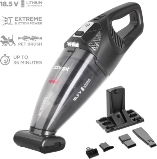 CONCEPT Real Force VP4380 to idealny pomocnik do codziennych, szybkich porządków. Wydajny akumulator Li-Ion 18,5 V (2200 mAh) w połączeniu z technologią cyklonową zapewnia stabilne i mocne ssanie do 8,2 kPa, dzięki czemu radzi sobie z okruchami, kurzem i sierścią. Do 35 minut pracy oraz trzy diody LED doświetlą nawet trudno dostępne miejsca.