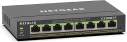 NETGEAR GS308EPP to niezawodny 8‑portowy gigabitowy przełącznik z PoE+, który oferuje łączny budżet 123 W do zasilania urządzeń sieciowych. Dzięki niesblokowanej architekturze każdy port wykorzystuje pełną prędkość gigabitową bez ograniczeń przepustowości. Konstrukcja bez wentylatora zapewnia cichą pracę odpowiednią do biur i domowych stanowisk.