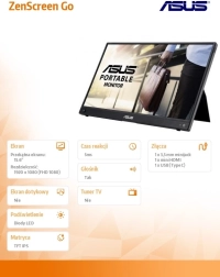 Przenośny monitor ASUS ZenScreen Go został zaprojektowany z myślą o łatwym przenoszeniu i użytkowaniu wszędzie tam, gdzie tego potrzebujesz. Ten 15,6‑calowy monitor oferuje wysoką rozdzielczość dla znakomitego obrazu oraz cechuje się niską masą dla prostej obsługi. To doskonały wybór dla osób potrzebujących jakościowego rozwiązania w podróży.
