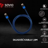 Niebiesko‑czarny kabel z oplotem zapewnia zwiększoną odporność na zużycie oraz stylowy wygląd.