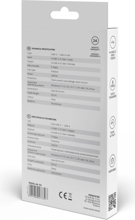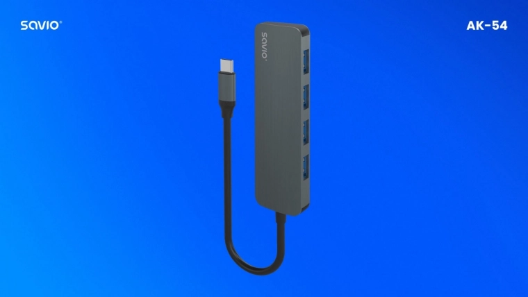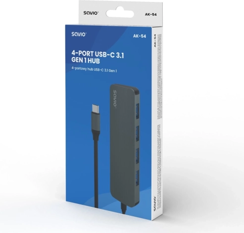 Rozszerz łączność swojego urządzenia z USB‑C dzięki kompaktowemu hubowi Savio. Cztery porty USB‑A umożliwiają jednoczesne podłączenie dysków zewnętrznych, klawiatur, myszy i innych peryferiów. Standard USB 3.1 Gen 1 zapewnia szybki transfer danych do 5 Gbps, a urządzenie jest wstecznie kompatybilne ze starszymi wersjami USB.