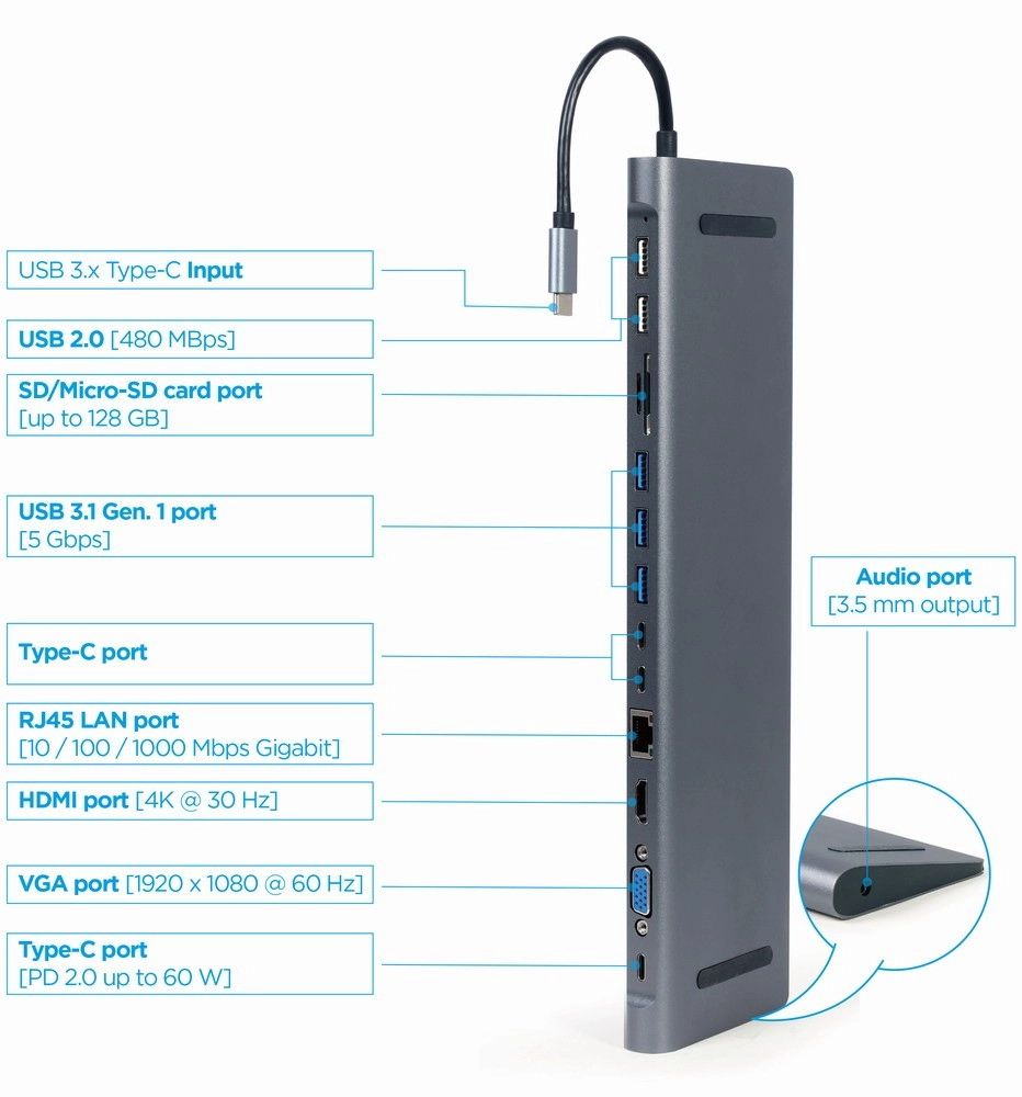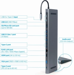 Kompaktowy, wieloportowy hub USB‑C 9w1 w eleganckiej metalowej obudowie łączy wszystkie Twoje połączenia w jednym urządzeniu. Oferuje HDMI 4K@30 Hz, VGA Full HD, Gigabit LAN, 3x USB 3.1 Gen 1 (5 Gb/s), 2x USB 2.0, USB‑C Power Delivery 60 W, czytnik SD/microSD oraz audio 3,5 mm. Proste Plug & Play bez sterowników.