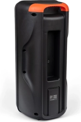 Przemyślana konstrukcja zawiera panel przedni z przyciskami sterującymi, porty dla różnych połączeń i praktyczną rączkę do łatwego przenoszenia. Zawartość opakowania obejmuje również kabel do ładowania i kabel AUX.