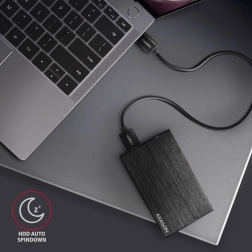 Obudowa oferuje HDD Auto Spindown (uśpienie dysku) oraz HDD Turn Off dla bardziej efektywnego zużycia energii. Wyposażona jest także w dyskretną niebieską diodę LED sygnalizującą połączenie i transfer danych.