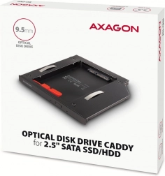 Ramka AXAGON RSS-CD09 jest przeznaczona do montażu w miejscu napędu CD/DVD o wysokości 9,5 mm i obsługuje dyski SATA 2.5" SSD/HDD. Dzięki kompatybilności z SATA 6G oferuje wykorzystanie nowoczesnych prędkości do 6 Gb/s bez utraty funkcjonalności, takich jak TRIM. Ramka jest wyposażona w podwójny przełącznik, który zapewnia szeroką kompatybilność z notebookami takimi jak LENOVO, HP, DELL i inne.