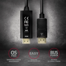 Aktywny adapter DisplayPort na HDMI marki AXAGON to idealne rozwiązanie do podłączenia urządzenia do monitora lub projektora HDMI. Ten kompaktowy kabel zapewnia przesył obrazu i dźwięku bez konieczności dodatkowej instalacji czy konfiguracji. Jego jednokierunkowa konstrukcja obsługuje komunikację z DisplayPort do HDMI.