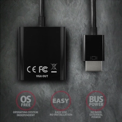 Adapter jest zasilany bezpośrednio z HDMI, więc nie potrzebuje zewnętrznego zasilania. Dzięki konwersji sprzętowej działa bez sterowników w dowolnym systemie operacyjnym i wspiera tryby duplikowania oraz rozszerzenia pulpitu. Kompaktowe wymiary i solidny przewód o długości ok. 17 cm czynią go idealnym towarzyszem w podróży i w biurze.