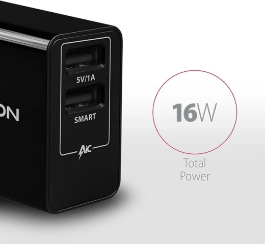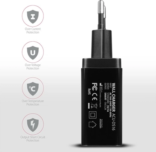 AXAGON ACU-DS16 to uniwersalna, podwójna ładowarka USB do gniazdka, która dzięki łącznej mocy 16 W niezawodnie zasila smartfony, tablety, słuchawki i inne akcesoria. Dwa wyjścia 5 V/1 A oraz SMART 5 V/2,2 A umożliwiają szybkie i bezpieczne ładowanie jednego lub dwóch urządzeń jednocześnie.