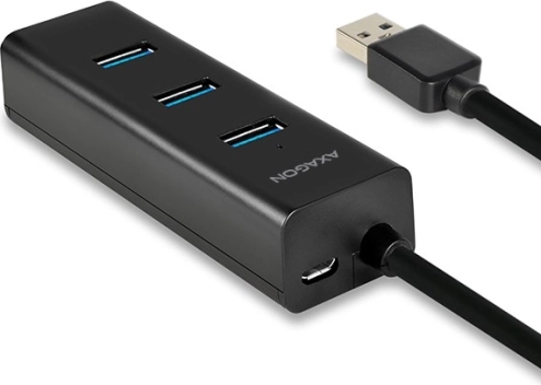 Kompaktowy hub USB AXAGON z czterema portami oferuje szybkie transfery USB 3.2 Gen 1 (5 Gb/s), wsparcie szybkiego ładowania BC 1.2 do 2 A na każdym porcie oraz możliwość zasilania zewnętrznego przez micro USB. Dzięki stałemu kablowi 30 cm, szerokiej kompatybilności i ochronie przed przeciążeniem jest idealny do laptopów i komputerów stacjonarnych.