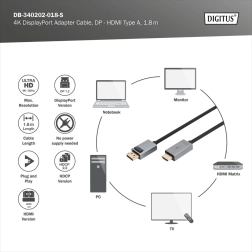 Niezawodny kabel do bezpośredniego połączenia urządzeń DisplayPort z monitorem lub telewizorem HDMI. Obsługuje 4K Ultra HD (3840 × 2160) przy 30 Hz, posiada pozłacane styki, zatrzask złącza DP oraz wytrzymałe aluminiowe korpusy z nylonowym oplotem dla długiej żywotności bez zakłóceń.