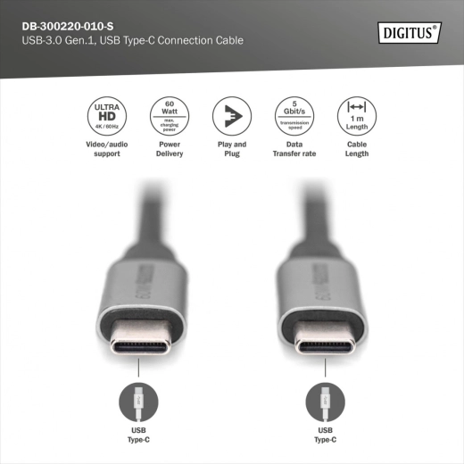 Kabel USB‑C 1 m z USB 3.0, transfer 5 Gbps, Power Delivery 60 W i wideo 4K 60 Hz. Wytrzymała aluminiowa konstrukcja, kompatybilny z Thunderbolt 3.