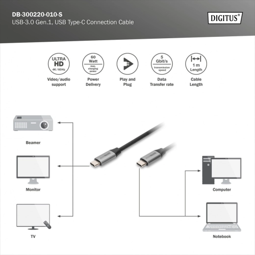 Uniwersalny kabel USB‑C do szybkiego przesyłu danych i ładowania. Obsługuje USB 3.0 do 5 Gbps, Power Delivery 60 W (20 V/3 A) oraz przesył audio/wideo do 4K przy 60 Hz. Kompatybilny z Thunderbolt 3 i urządzeniami z USB‑C.