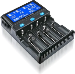 Uniwersalna ładowarka o wyjątkowo szerokiej kompatybilności dla ogniw Li‑ion, Li‑HV, LiFePO4 i Ni‑MH. Obsługuje rozmiary AA, AAA, C, D, 9V oraz ogniwa Li‑ion od 10440 aż po 33600, w tym 20700/21700 z ochroną. Dzięki maksymalnej długości prowadnic 76 mm wygodnie naładujesz także dłuższe akumulatory.