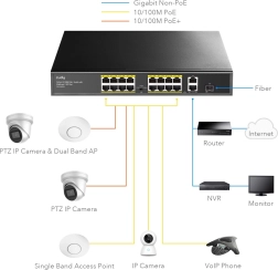 Przełącznik z 16 portami 10/100M PoE+ jest zaprojektowany do efektywnego zasilania i przesyłu danych w aplikacjach sieciowych. Z wbudowanymi 2 portami uplink 10/100/1000M oraz portem SFP oferuje elastyczność rozbudowy sieci.