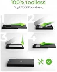 Instalacja dysków jest w 100% beznarzędziowa – wystarczy otworzyć wieczko, włożyć dysk, zamknąć i można zaczynać korzystanie. Obudowa obsługuje 2,5-calowe dyski SATA I/II/III o maksymalnej wysokości 9,5 mm, co gwarantuje szeroki zakres kompatybilnych nośników.
