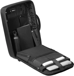 Plecak ma kieszenie na kartę miejską lub dokumenty w szelkach, a ergonomiczne piankowe wypełnienie EVA zapewnia wygodę. Główna komora otwiera się pod kątem 180° i zawiera panel organizacyjny oraz elementy odblaskowe dla lepszej widoczności. Kieszeń na laptop do 16" i na tablet do 12,9".