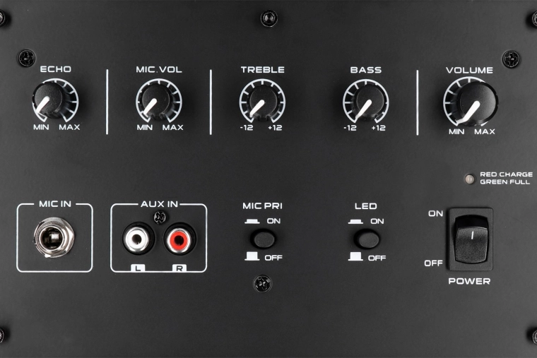 Na panelu sterowania znajdziesz oddzielne regulacje basów i wysokich tonów, a także korektor z trybami Normal, Rock, Pop, Classic, Jazz i News. Funkcja TWS (True Wireless Stereo) pozwala połączyć dwa MB06.2, by uzyskać szerszą scenę i prawdziwy efekt stereo. Karaoke z dołączonym przewodowym mikrofonem rozświetli każdą imprezę, a światła LED stworzą efektowną klubową atmosferę.