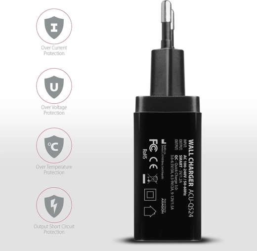 AXAGON ACU-QS24 została zaprojektowana do bezpiecznego i efektywnego ładowania Twoich urządzeń mobilnych. Dwa niezależne porty USB oferują technologię Quick Charge 3.0 oraz Smart 5V/1.2A, dzięki czemu szybko naładujesz telefony i tablety.
