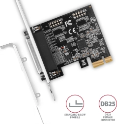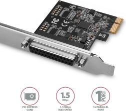 Ta karta PCI-Express doda do Twojego PC niezawodny port równoległy do podłączania drukarek, ploterów, programatorów EPROM, kluczy sprzętowych i innego osprzętu przemysłowego. Bezproblemową kompatybilność zapewnia sprawdzony chipset ASIX AX99100, który obsługuje tryby SPP/BYTE/ECP i prędkość transmisji do 1,5 MB/s.