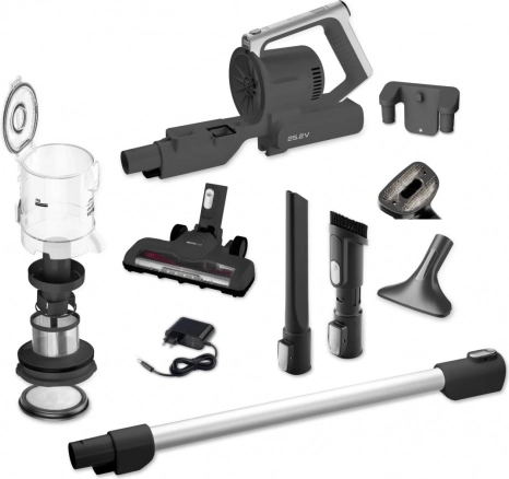 Na wyposażeniu znajdują się specjalna końcówka PET do sierści zwierząt, końcówka SOFA (do tapicerki), akcesoria szczelinowe oraz nasadka do książek i delikatnych powierzchni. Uchwyt ścienny ułatwia przechowywanie odkurzacza i akcesoriów, a zabezpieczenie baterii przed przegrzaniem oraz filtr wstępny wydłużają żywotność urządzenia.