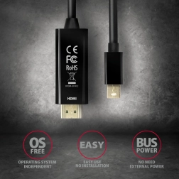 Aktywny kabel AXAGON Mini DisplayPort → HDMI łączy w sobie konwerter i przewód połączeniowy w jednym rozwiązaniu. Wystarczy podłączyć, aby natychmiast przesyłać obraz i dźwięk do urządzeń HDMI. Obsługuje rozdzielczości do 4096 × 2160 przy 30 Hz, co gwarantuje ostry obraz oraz płynne prezentacje i wideo w 4K.