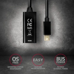 Aktywny adapter mini DisplayPort → HDMI AXAGON RVDM-HI14N to niezawodne rozwiązanie do podłączania wyświetlaczy HDMI do komputerów z mini DisplayPort. Zapewnia wysoką jakość transmisji wideo do 4K/30 Hz, a jednocześnie przesyła cyfrowe audio. Dzięki kompaktowym wymiarom sprawdza się w ciasnych przestrzeniach i nie wymaga zewnętrznego zasilania.
