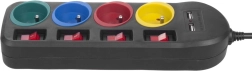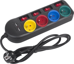 Każde z kolorowych gniazdek posiada własny wyłącznik, co umożliwia kontrolę nad zasilaniem urządzeń i zwiększa bezpieczeństwo.