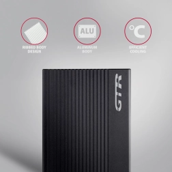 Zastosowanie żebrowanej aluminiowej obudowy przyczynia się do efektywnego chłodzenia i ochrony dysku, podczas gdy gumowe nóżki zapewniają stabilność na powierzchni. Elegancki design dodatkowo zapobiega niechcianym odciskom palców.