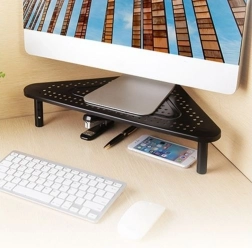Regulowany stojak na monitor lub laptop jest wykonany z solidnego materiału stalowego i został zaprojektowany tak, aby pasować do każdego rogu dzięki swojemu trójkątnemu kształtowi. Ten produkt oferuje: