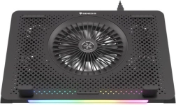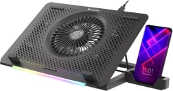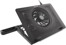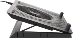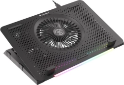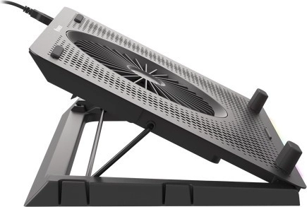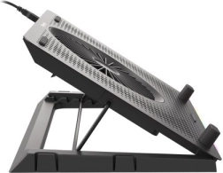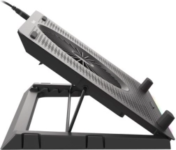 System chłodzenia tworzy 1 duży wentylator do nawiewu chłodnego powietrza oraz 4 mniejsze wentylatory do efektywnego odprowadzania ciepła. Dzięki dwustopniowej regulacji prędkości obrotowej łatwo dopasujesz wydajność do pracy lub gry. 5 poziomów nachylenia poprawia ergonomię i komfort, a gumowe ograniczniki i nóżki utrzymują laptop bezpiecznie na miejscu.
