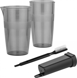 Zawiera dwa miarki, szczoteczkę do czyszczenia i stojak na akcesoria do lepszego przechowywania.