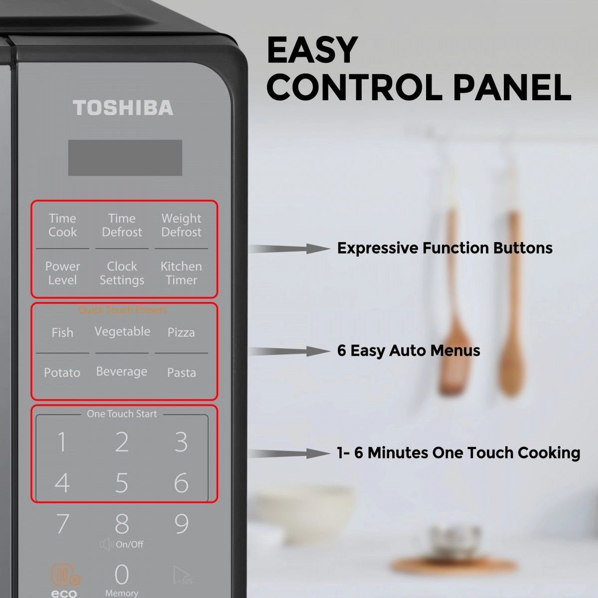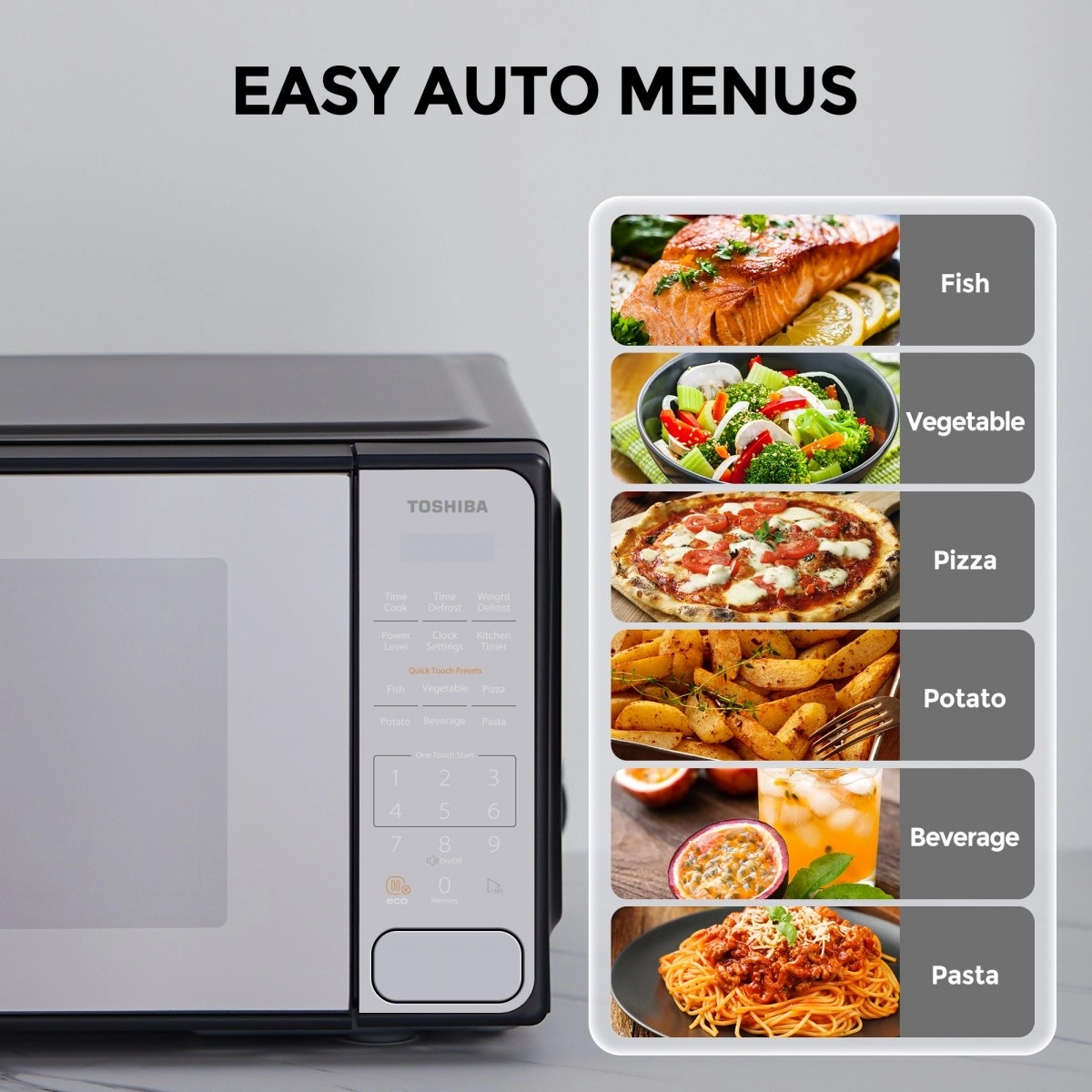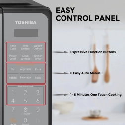 Kuchenka mikrofalowa Toshiba MM2-EM20PF(MB) to wolnostojąca mikrofala o pojemności 20 litrów z szybkim ustawianiem dotykowym, 10 poziomami mocy i łatwym rozmrażaniem.
