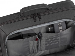 Przednia kieszeń oferuje miejsce na akcesoria, takie jak myszki i dyski, a specjalny organizer utrzymuje wszystko na swoim miejscu. Odkryj przestrzeń na kable i źródło zasilania.
