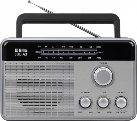 Julia 3 to niezawodne analogowe radio do codziennego słuchania w domu, na działce czy w warsztacie. Dzięki dużej, czytelnej skali łatwo dostroisz wybraną stację, a wygodne pokrętła pozwolą szybko dopasować głośność i charakter brzmienia do Twoich preferencji.
