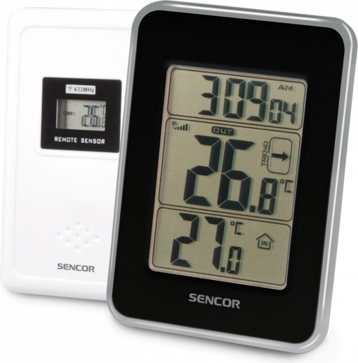 Stacja pogodowa Sencor oferuje dokładny pomiar temperatury z bezprzewodowym czujnikiem do użytku wewnątrz i na zewnątrz. Zapewnia także funkcje takie jak wyświetlanie czasu i trendu temperatury.