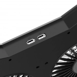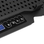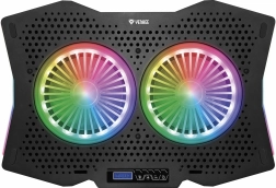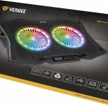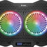 Ta uniwersalna podkładka chłodząca została zaprojektowana z myślą o efektywnym odprowadzaniu ciepła i cichej pracy. Solidna metalowa perforowana siatka poprawia cyrkulację powietrza i chroni urządzenie, a oświetlenie RGB dodaje Twojemu stanowisku stylu. Zintegrowany panel LCD umożliwia szybkie ustawienie prędkości wentylatorów i efektów świetlnych.
