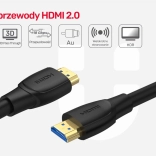 Standard HDMI 2.0 oferuje przepustowość do 18 Gbps, dzięki czemu bez problemu obsługuje rozdzielczość 4K przy 60 Hz, HDR, ARC (zwrotny kanał audio), EDID, CEC oraz 3D. Kabel idealnie nadaje się do łączenia telewizorów, projektorów, amplitunerów AV, konsol i odtwarzaczy multimedialnych na dłuższe dystanse.