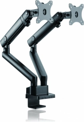 Praktyczny podwójny uchwyt na monitory do 32" z mechanizmem sprężynowym umożliwia łatwy montaż dwóch monitorów. Wyjmowane adaptery VESA i przemyślane prowadzenie kabli zapewniają łatwe użytkowanie i organizację przestrzeni.