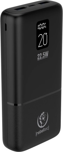 Powerbank Rebeltec P20 to niezawodne źródło energii w podróży i w pracy. Dzięki pojemności 20000 mAh poradzi sobie z wieloma pełnymi doładowaniami telefonu, słuchawek lub tabletu. Wsparcie szybkiego ładowania PD 22,5 W gwarantuje, że kompatybilne urządzenia naładujesz szybko i bezpiecznie.