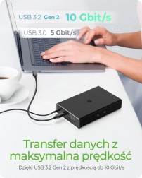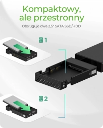 Zwiększ pojemność i uprość zarządzanie danymi dzięki zewnętrznej aluminiowej obudowie dla dwóch dysków 2,5" SATA SSD/HDD. Urządzenie obsługuje cztery tryby: RAID 1 dla maksymalnej ochrony, RAID 0 dla prędkości, SINGLE dla niezależnych dysków oraz LARGE dla połączenia pojemności. Połączenie USB 3.2 Gen 2 (10 Gb/s) zapewnia błyskawiczne kopiowanie i płynną pracę z rozbudowanymi projektami.