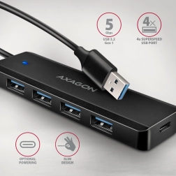 Kompaktowy i lekki hub USB AXAGON HUE‑C1A rozszerzy Twój laptop lub PC o cztery porty USB 3.2 Gen 1 z prędkością do 5 Gb/s. Zintegrowany 19‑cm kabel USB‑A jest idealny w podróży, a dzięki dodatkowemu zasilaniu przez USB‑C łatwo podłączysz także bardziej wymagające urządzenia lub kilka dysków zewnętrznych. Nie zabrakło Plug & Play, Hot Plug oraz ładowania telefonów do 1,5 A na port.