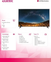 Ciesz się ostrym obrazem i inteligentnymi funkcjami z 43" telewizorem LED LG UR781. Oferuje rozdzielczość 4K UHD, smukły, nowoczesny design, inteligentne środowisko Smart TV oraz stabilne podstawy, które świetnie wpasują się w każdy nowoczesny wystrój wnętrza.