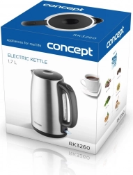 Czajnik elektryczny Concept 1,7 l RK3260 pozwala łatwo przygotować wystarczającą ilość wody dla całej rodziny. Wykonany z wysokiej jakości stali nierdzewnej, odpornej na korozję i łatwej w utrzymaniu.