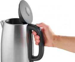 - Łatwa obsługa i pielęgnacja: Czajnik wyposażono w przycisk do wygodnego otwierania pokrywy oraz szeroki otwór ułatwiający nalewanie wody.