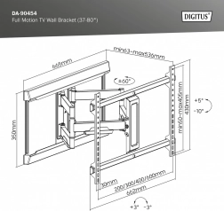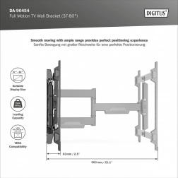 Uchwyt oferuje wysuwane ramię w zakresie od 6,3 do 53,6 cm, co umożliwia optymalne ustawienie kąta dla idealnego oglądania. Możliwość obrotu w zakresie od +60 do -60° oraz pochył od +5 do -10° zapewniają dopasowanie do potrzeb użytkownika. Pozioma rotacja w zakresie +3 do -3° gwarantuje precyzyjne ustawienie ekranu.