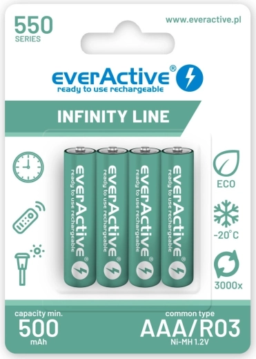 Zestaw 4 akumulatorów AAA R03 o pojemności 550 mAh w technologii ready to use do natychmiastowego użycia. Seria Infinity Line jest idealna do lamp solarnych, telefonów bezprzewodowych oraz innych urządzeń o niskim i średnim poborze, gdzie doskonale zastępuje baterie jednorazowe, przynosząc oszczędność ekonomiczną i ekologiczną.