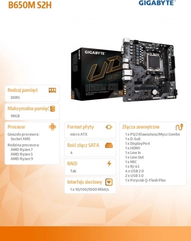 Kompaktowa płyta główna GIGABYTE B650M S2H dla gniazda AM5 zapewnia obsługę procesorów AMD Ryzen 7000, nowoczesnych pamięci DDR5 oraz dysków M.2 PCIe 4.0. Oferuje stabilne zasilanie 5+2+2 faz, szybką sieć GbE LAN i szeroką łączność: HDMI, DisplayPort i D-Sub. Dzięki funkcjom Q-Flash Plus i Smart Fan 6 łatwo zaktualizujesz BIOS i utrzymasz system chłodny oraz cichy.